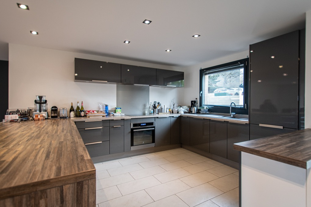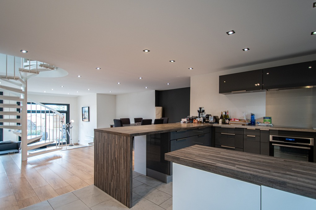 Au rez, un dégagement offrant une belle ouverture sur la cuisine ouverte sur la salle-à-manger, un sas composé d’un WC visiteur, placards coulissants et buanderie / chaufferie ainsi qu’une chaleureuse pièce de vie en demi-niveau disposant d’une cheminée et de plusieurs accès à la terrasse.