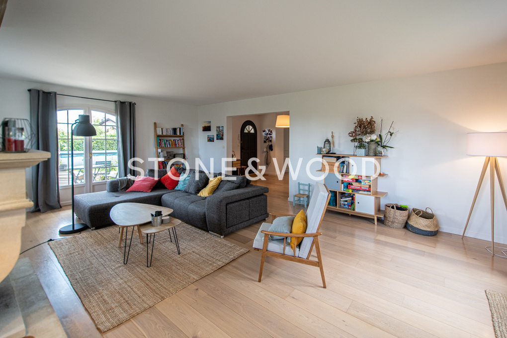 Charme et authenticité pour cette propriété de 244 m2 habitables + 88 m2 utiles mélangeant le moderne et l’ancien. La maison possède également un grand garage double, l’ensemble implanté sur une parcelle close et arborée de 1’084 m2. Ses finitions de bonne qualité et ses beaux volumes vous séduiront. La propriété se compose d’une cuisine équipée indépendante refaite à neuve avec accès terrasse, d’un grand séjour avec cheminée donnant sur le jardin. Bureau. Bibliothèque. 5 chambres dont une grande suite parentale avec dressing et salle d’eau. Grand sous-sol complet comprenant notamment une cave-à-vin et une salle de jeux avec cuisine équipée. Cadre calme et résidentiel. Golf de Maison-Blanche à 2 km, aéroport de Genève à 15 minutes et centre commercial à 5 kms. DPE : D Honoraires TTC à la charge du vendeur.