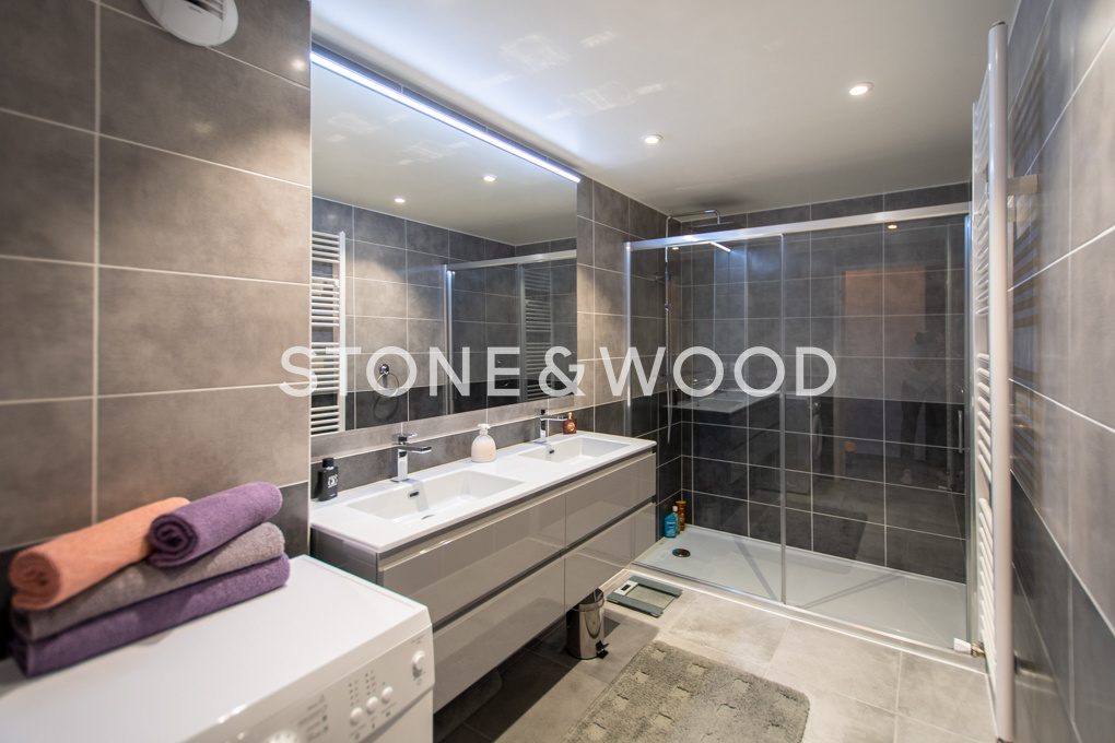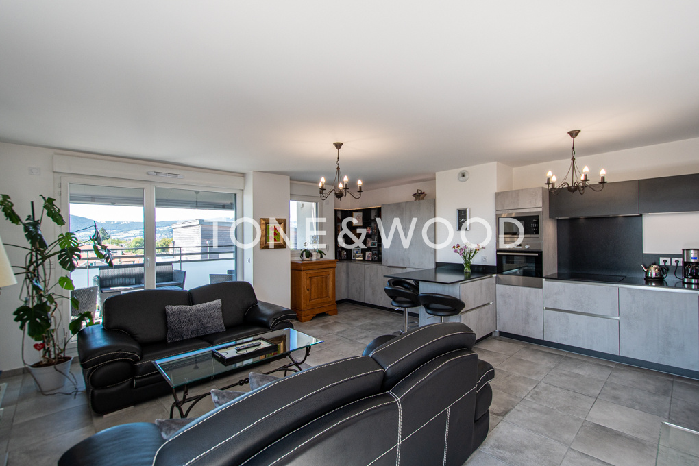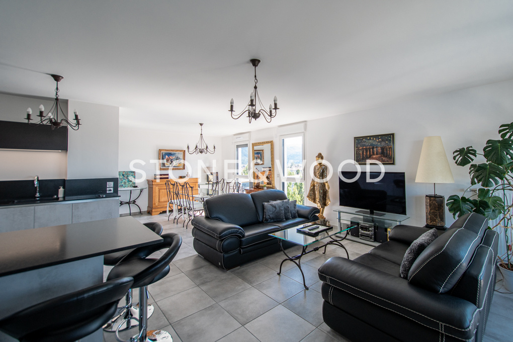 A proximité du centre-ville, quartier des Romains à Annecy. Au dernier étage avec ascenseur d’une copropriété moderne, grand appartement type 3 de 80 m2 en triple exposition. Vaste séjour avec salon et salle-à-manger, cuisine équipée ouverte et accès sur la terrasse de 11 m2 idéalement exposée Ouest. Vue dégagée sur toutes les montagnes environnantes. Le coin nuit se compose de 2 chambres, d’une salle d’eau avec double vasque et de WC séparés. Rangements. Parking de copropriété fermé. Local à vélos. Garage possible. A deux pas des commodités : supermarché, commerces de proximités, bus, écoles, infrastructures sportives. Accès direct à l’autoroute. DPE : C – Copropriété de 35 lots – Pas de procédure en cours – Charges annuelles : 1300EUR Honoraires TTC inclus à la charge du vendeur
