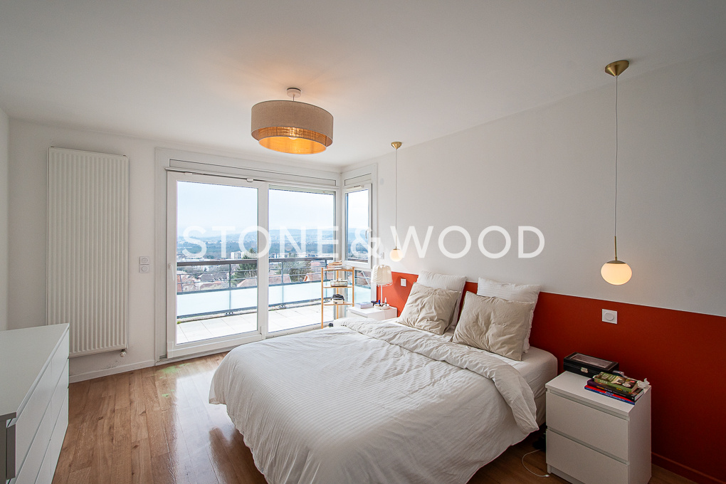 D’une surface d’env. 128 m2 utiles (112,85 m2 Loi Carrez), l’appartement présente de beaux volumes prolongés par 2 terrasses et un balcon offrant de belles vues dégagées sur Annecy et les montagnes. Il se compose d’un hall d’entrée, d’un vaste salon/séjour de 50 m2 avec cuisine équipée semi ouverte et accès à une terrasse de 23 m2. 3 chambres avec dressings et 2 salles d’eau. Cave et garage avec prise électrique.
