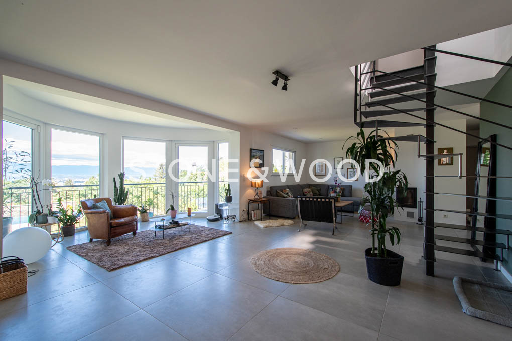 Emplacement idéal à 5 min de la douane de la Croix de Rozon, à 20 min de Genève et 25 de son aéroport. Magnifique villa d’architecte située dans un cadre calme et verdoyant à proximité de toutes les commodités. Entièrement rénovée en 2021, la maison est lumineuse et offre de magnifiques vues dégagées sur Genève et le lac. D’une surface d’environ 196 m2 habitables (236 m2 utiles) répartis sur 3 niveaux, cette propriété familiale se compose au rez-de-chaussée, d’une grande pièce de vie prolongée par un balcon/terrasse et comprenant une cuisine équipée ouverte, un salon TV avec cheminée et une salle à manger. A l’étage, chambre en-suite avec dressing et salle d’eau. Au rez-de-chaussée inférieur, 4 chambres dont une suite parentale avec dressing, salle-de-bains et WC. 2 salles d’eau avec WC. Nombreux rangements. Buanderie. Cave. Grand garage avec mezzanine. A l’extérieur, parcelle close et arborée de 1’334 m2 avec piscine chauffée, terrasse en bois, et serre à potager. DPE: C Honoraires TTC à la charge du vendeur