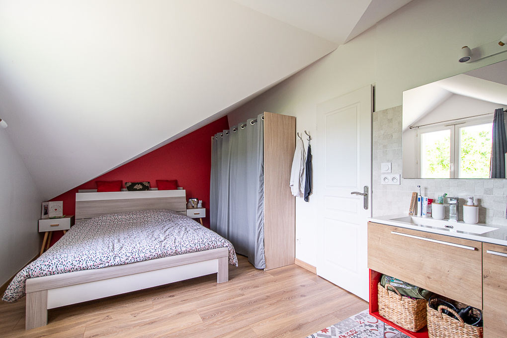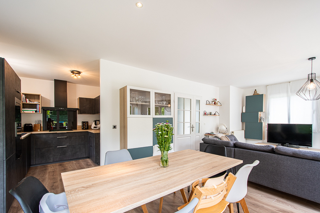 L’intérieur d’environ 110 m2 se compose, au rez, d’une grande pièce de vie avec cuisine ouverte, espace salle à manger et salon TV équipé de meubles sur mesures. L’étage est réparti sur 2 demi-niveaux avec une grande chambre parentale, son espace salle de douche et ses nombreux rangements. Un niveau dédié aux enfants comprend 3 belles chambres et une salle-de-bains.