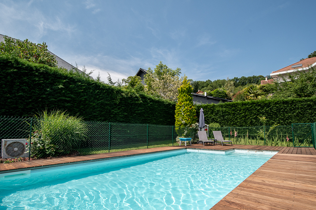Sa parcelle de 1’000 m2 est entièrement clôturée et arborée avec de belles terrasses, un potager et une grande piscine chauffée.