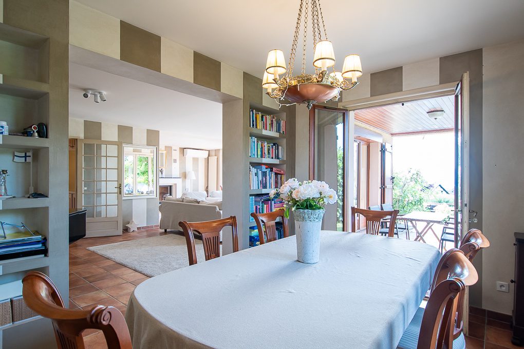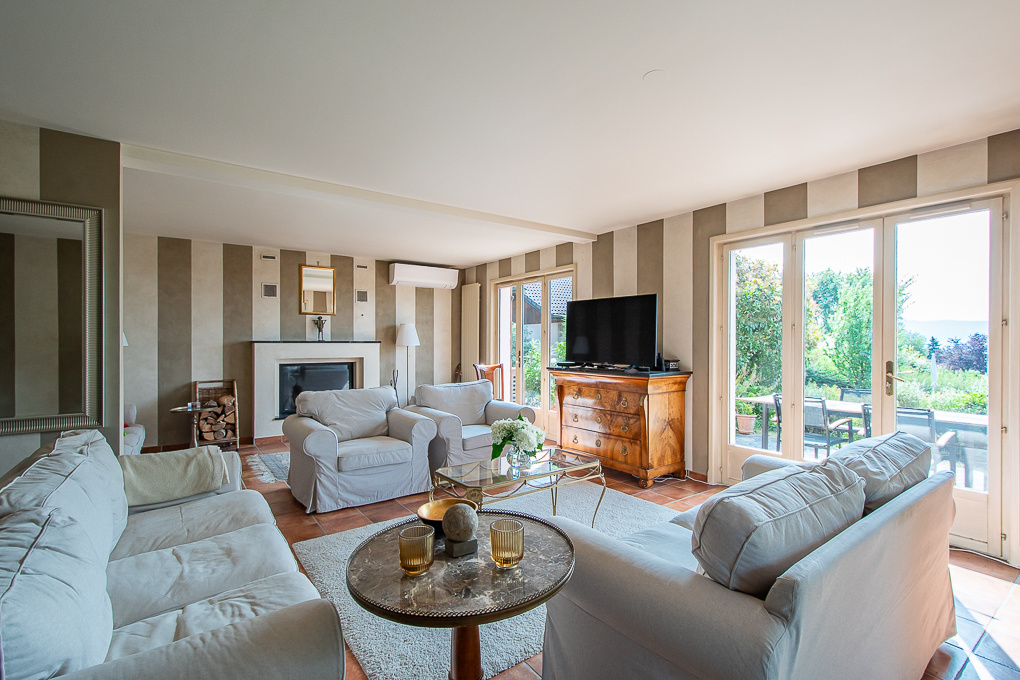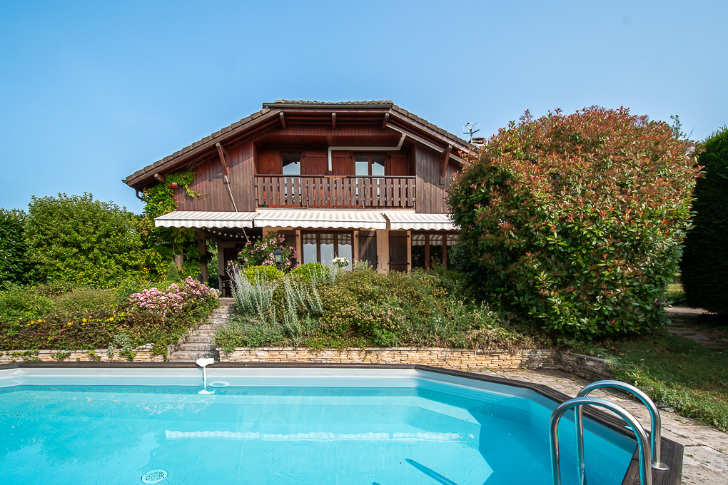 Située au calme absolu avec une vue dégagée sur les Alpes, la vallée du Rhône et le Jura, la propriété bénéficie d’un grand jardin dans un environnement paisible et familial. Alliant le côté chaleureux des chalets et le confort d’une propriété moderne, elle se compose d’un spacieux salon avec cheminée et accès terrasse, d’une salle à manger et d’une cuisine équipée indépendante. 4 chambres dont 2 en-suite avec salle d’eau/salle-de-bains. Salle-de-bains avec WC. Buanderie et garage double indépendant.