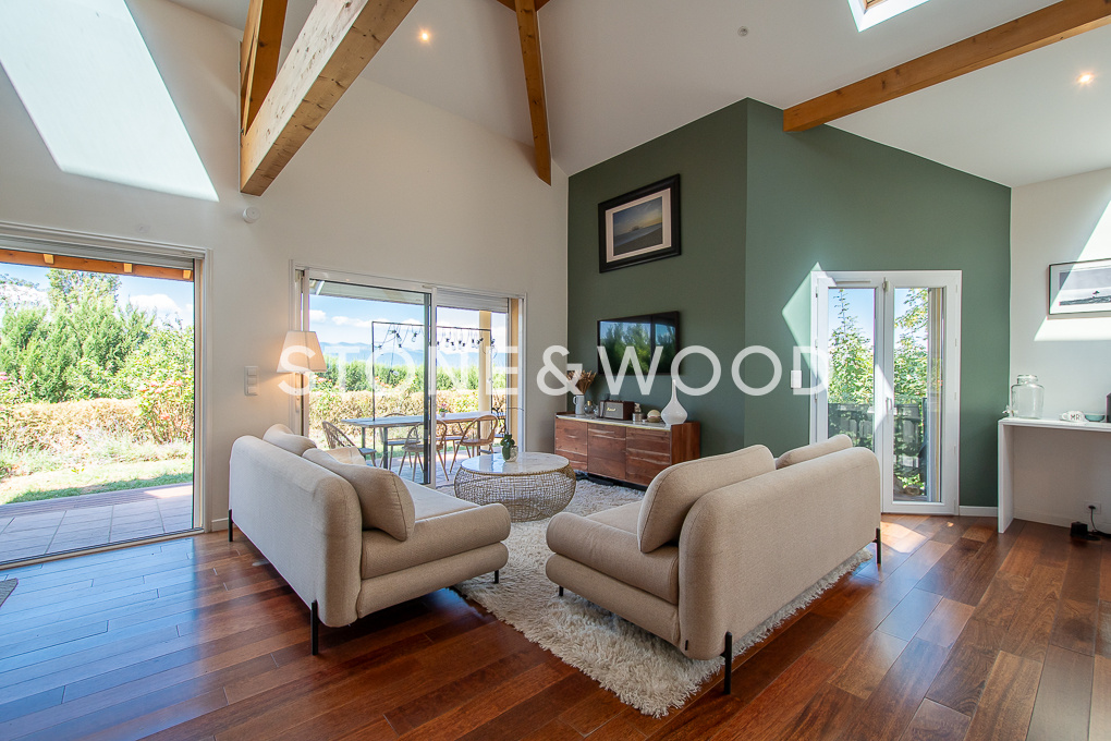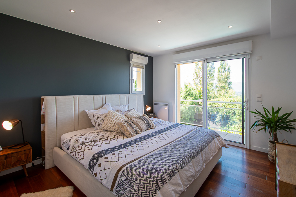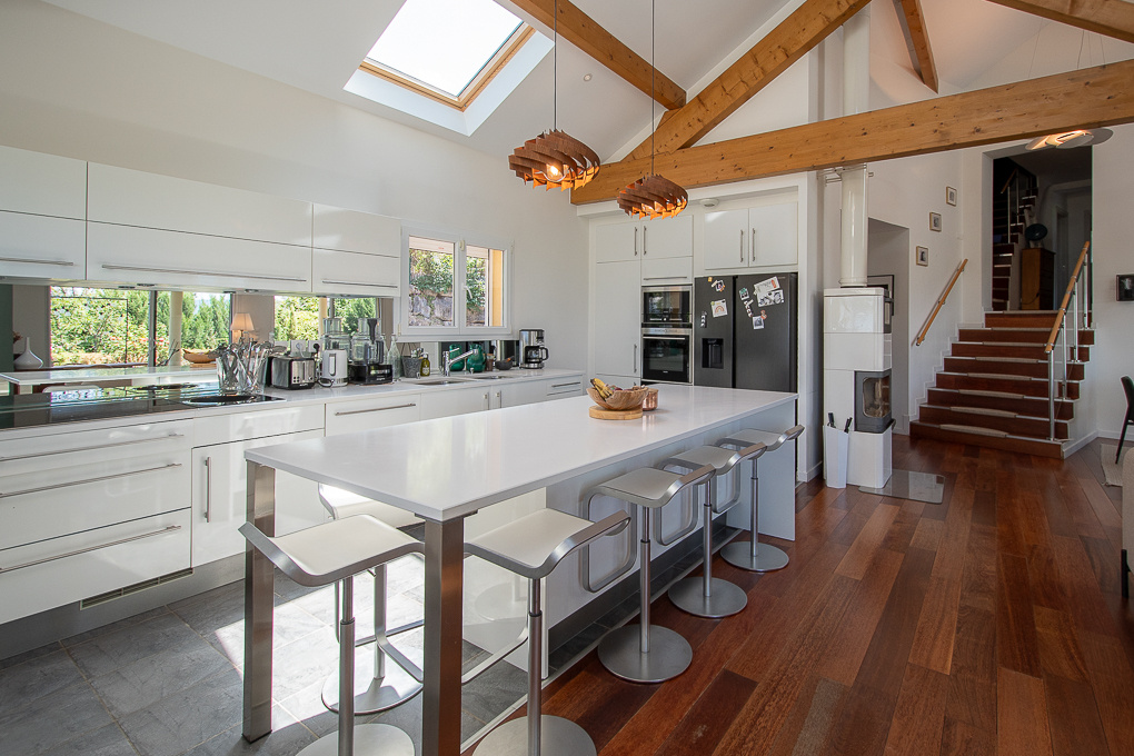 L’intérieur comprend une spacieuse pièce de vie cathédrale avec cuisine équipée ouverte sur le salon/séjour avec poêle à bois et plusieurs accès terrasse. 5 chambres dont une en-suite avec dressing, salle-de-bains et balcon. Grande mezzanine. Second salon au rez inférieur. Salle de sport. Buanderie. Garage et places de parking. DPE: NC