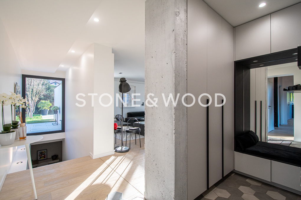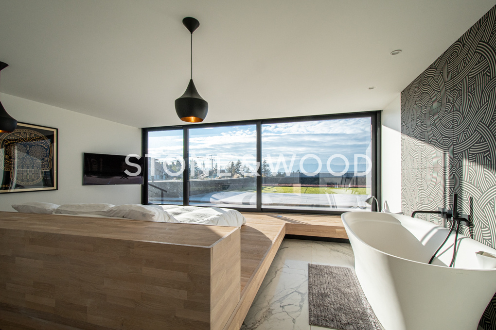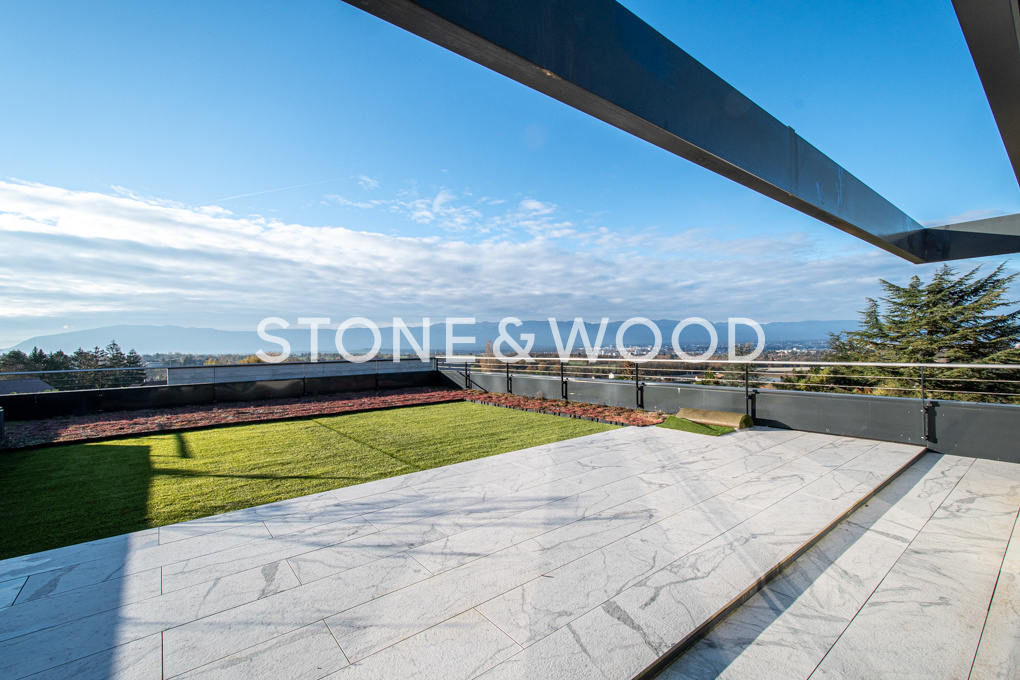 L’intérieur est spacieux et très ouvert sur les extérieurs avec terrasses, piscine chauffée et grand jardin arboré. Ses larges baies vitrées permettent de profiter de la luminosité naturelle et des vues exceptionnelles sur Genève, le lac et le jet d’eau.