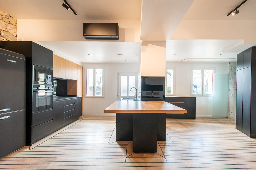 Chauffage au sol (pompe à chaleur), climatisation, ventilation double flux. Garage motorisé inclus avec rangements.