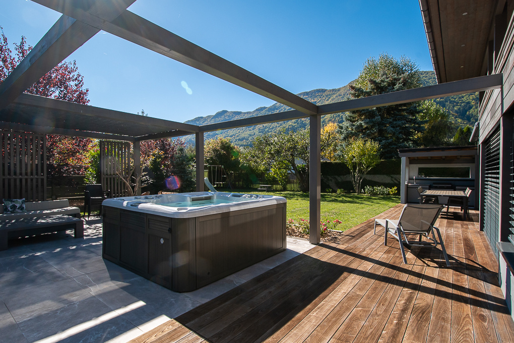 Exclusive.In a green and quiet setting with beautiful mountain views, only 15 minutes from Annecy and 10′ from the lake.Architect-designed house of 215 sqm with modern fittings and spacious rooms filled with natural light thanks to the many bay windows providing many outdoor accesses. The villa comprises a large living room with an open-plan fitted kitchen and a pantry, a dining room and a lounge with wood stove. 4 bedrooms including a large master suite with dressing room, shower room and balcony access.Outdoor, 950 sqm enclosed plot with a wooden terrace, summer kitchen, pergola area with spa. Garage for 2 cars and outdoor parking spaces. DPE: CInformation regarding the risks to which this property is exposed is available on the website georisques.gouv.frAgency fees chargeable to the seller.