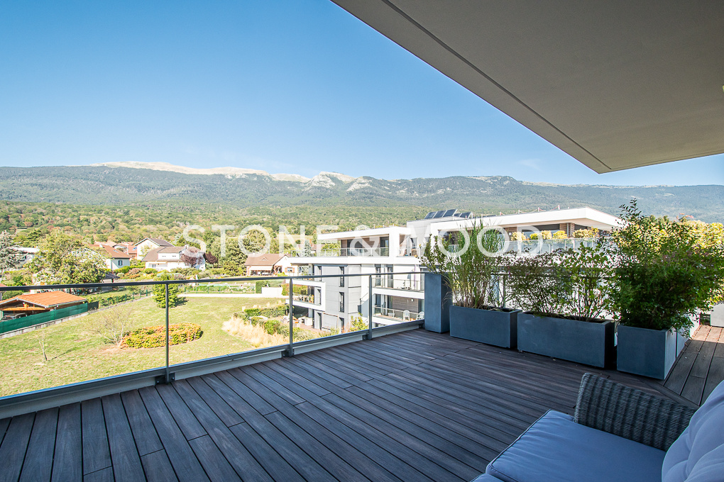 In a modern condominium, magnificent penthouse of 145 sqm with 185 sqm terrace enjoying beautiful views of the Alps and the Jura mountains.It comprises a spacious dual aspect living room, an open-plan fitted kitchen with central island, 4 bedrooms (including 2 with ensuite shower room) and 3 shower rooms. Each bedroom and living room has its own access to the terrace around the flat providing natural light throughout the day.A cellar and a large garage with 2 parking spaces and a storage room complete this beautiful flat.Located in a quiet and residential area of Thoiry close to all amenities, 5 minutes from the Lycée International de Ferney-Voltaire, 10 minutes from the CERN and 15 minutes from Geneva airport.Subject to the status of the co-ownership. Condominium charges: EUR450,00/month. DPE: CInformation on the risks to which this property is exposed is available on the georisques.gouv.fr website.Agency fees chargeable to the seller.Your contact :Marylou FERNANDEZ Sales agent+33 6 65 06 64 00mfernandez@stoneandwood.frRSAC : 911 265 692