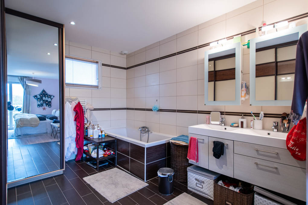 Upstairs, 3 bedrooms including one with en-suite bathroom, double sink, large dressing room and balcony. Shower room with double sink and WC. Convertible attic. Garage with laundry room and storage. Cellar under garage. Parking spaces. DPE: NC