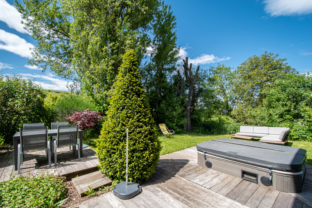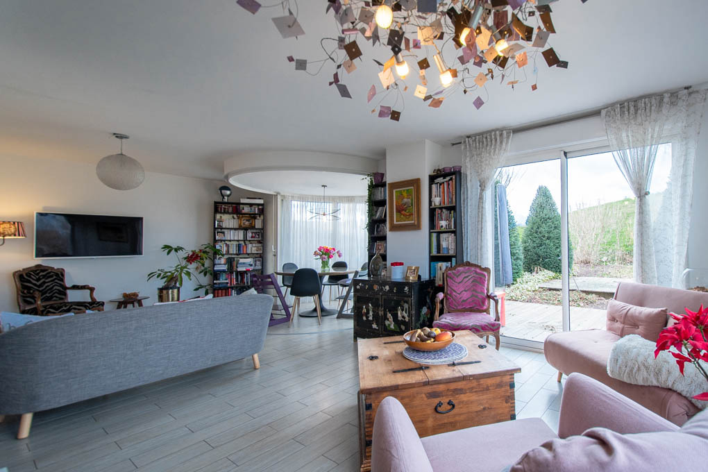 Established on 3 levels, this bright house consists on the ground floor of a semi-open kitchen into the living room with a lounge and a dining room with a ‘lumicene’, a rounded bay window, and several accesses to the terrace and the garden. Separate WC with washbasin.