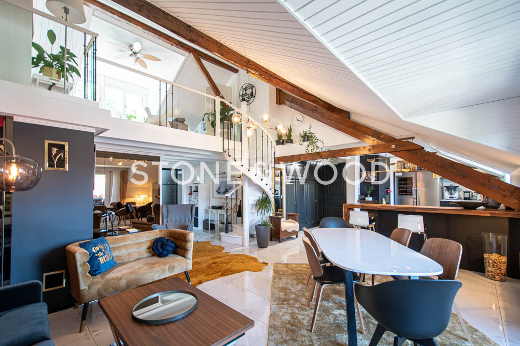 In a magnificent farm house, charming duplex of around 147 usfull sqm. Spacious fitted kitchen open to cathedral lounge with fireplace and balcony. 3 en-suite bedrooms, one with dressing room, bathroom and wc. Mezzanine / 2nd living room. Co-ownership garden. Cellar. 2 covered parking spaces + condominium parking. Location in the center of Archamps, close to transport, shops and schools. DPE: D. The property is subject to the status of the condominium (10 lots). The share of the forecast seller charge budget (current expenses) is around EUR 3,300 / year.