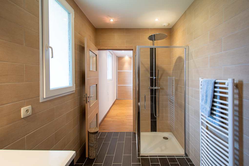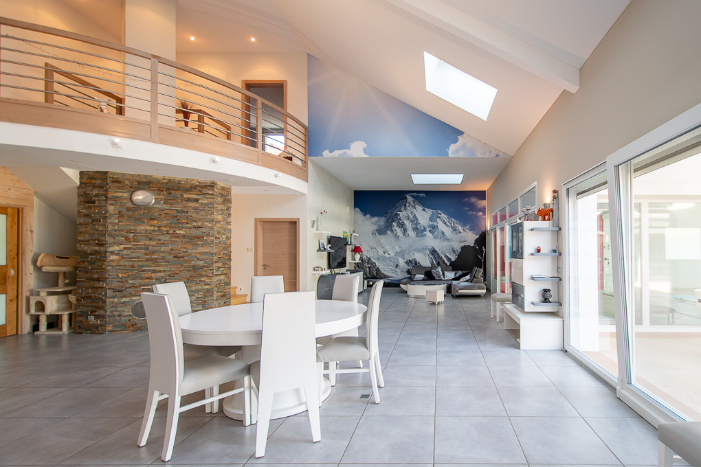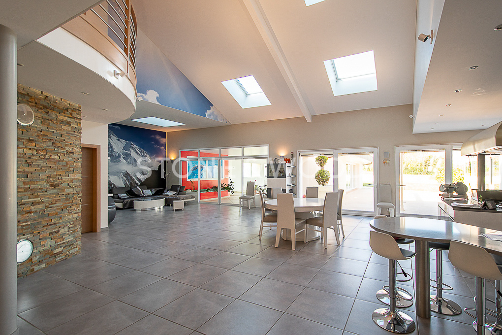 Spacious modern villa of approx. 420 sqm on 3 levels with beautiful volumes and high quality services. It comprises a large living room with cathedral ceiling, open-plan fitted kitchen, dining room and lounge with accesses to the terrace and the indoor pool. 4 bedrooms including two with ensuite bathroom. Mezzanine and study. Large basement with technical room. Workshop. DPE: A